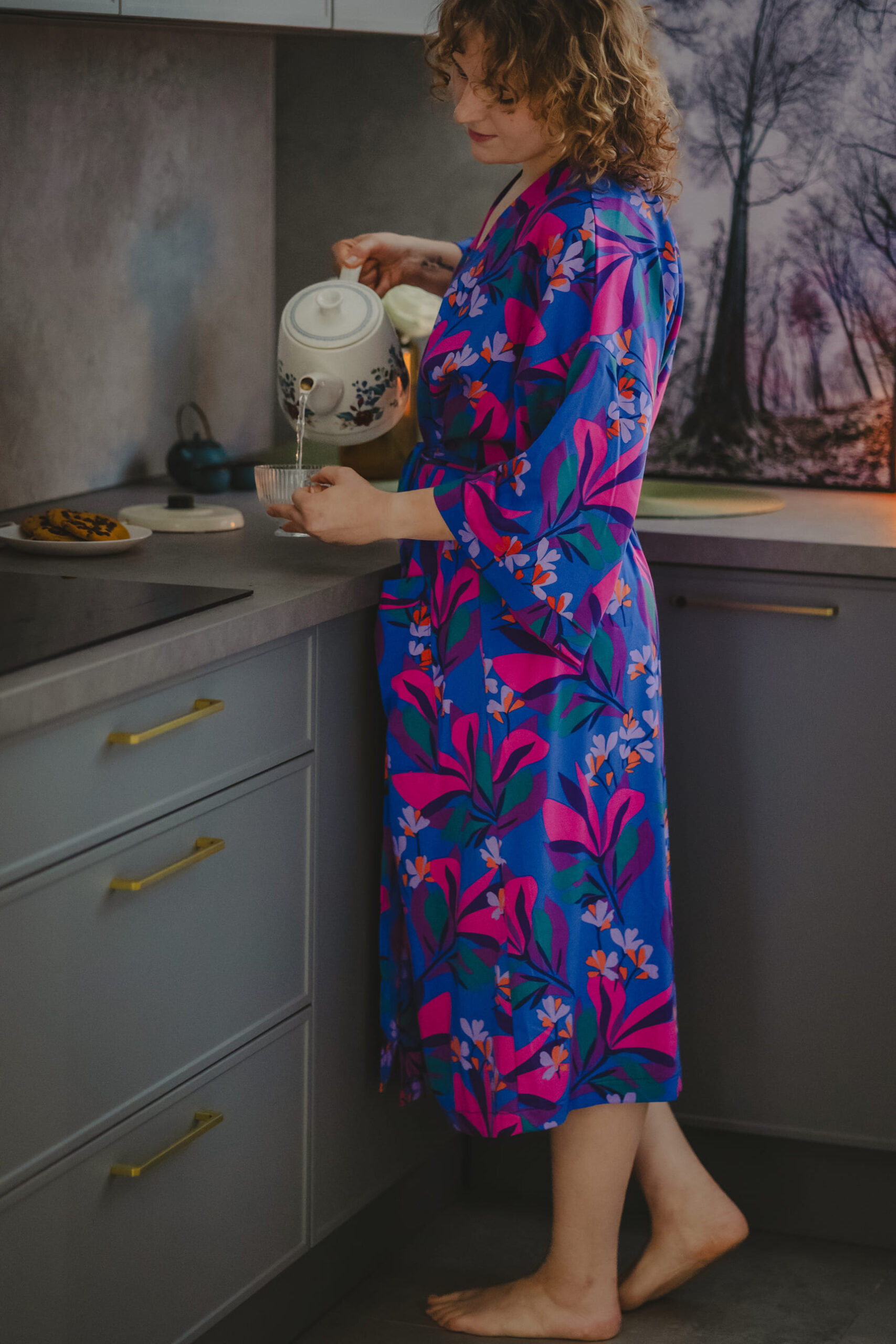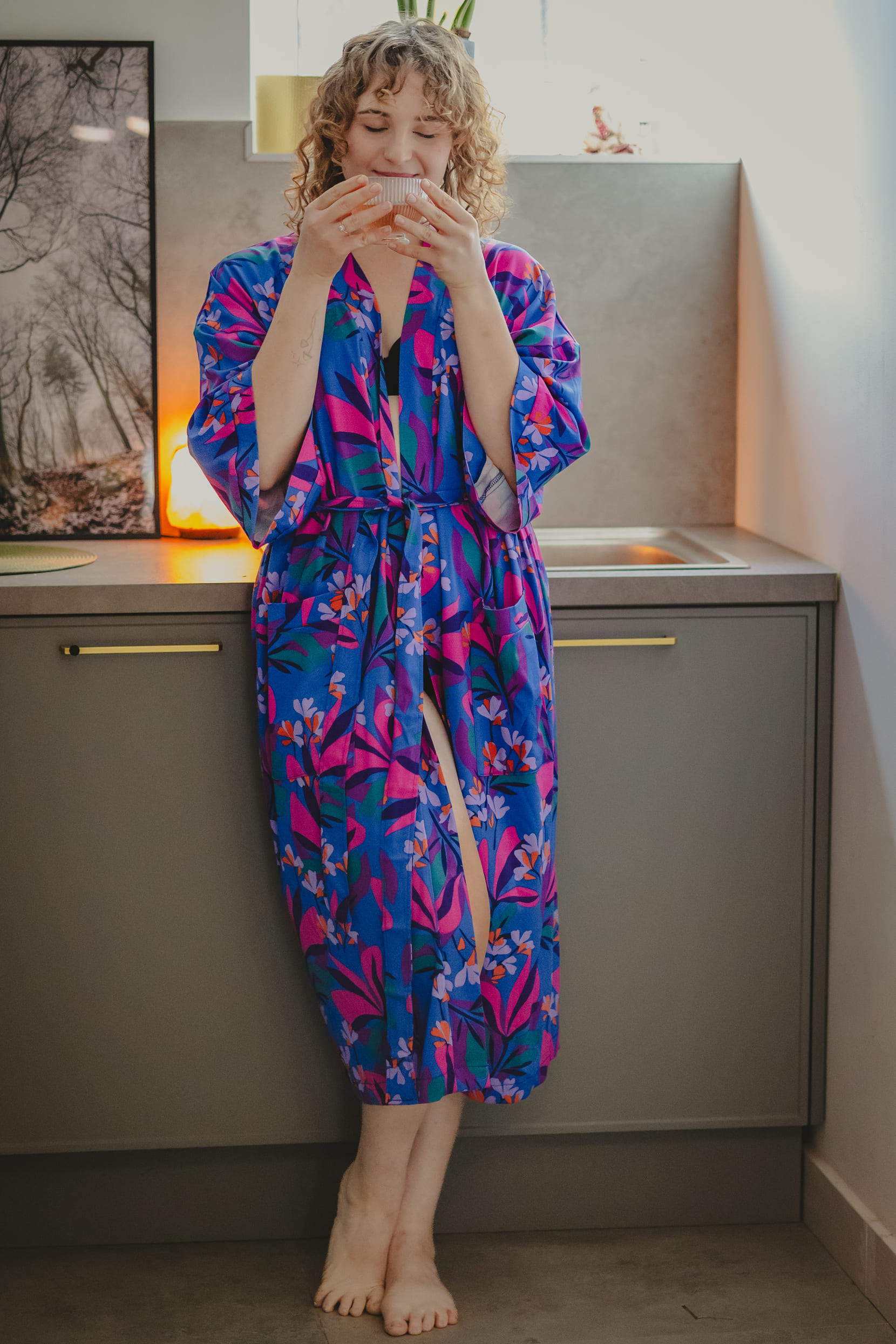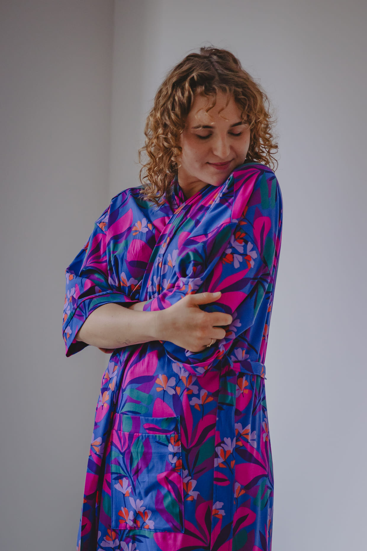 Długi szlafrok o kroju kimonowym, w którym każda mama odnajdzie wygodę i piękno, niezależnie od etapu macierzyństwa. To kobiecy, elegancki komfort, który towarzyszy Ci od pierwszych dni ciąży, przez karmienie, aż po późniejsze chwile domowego odpoczynku. Sprawdzi się nie tylko jako tradycyjny szlafrok, ale też jako narzutka plażowa.