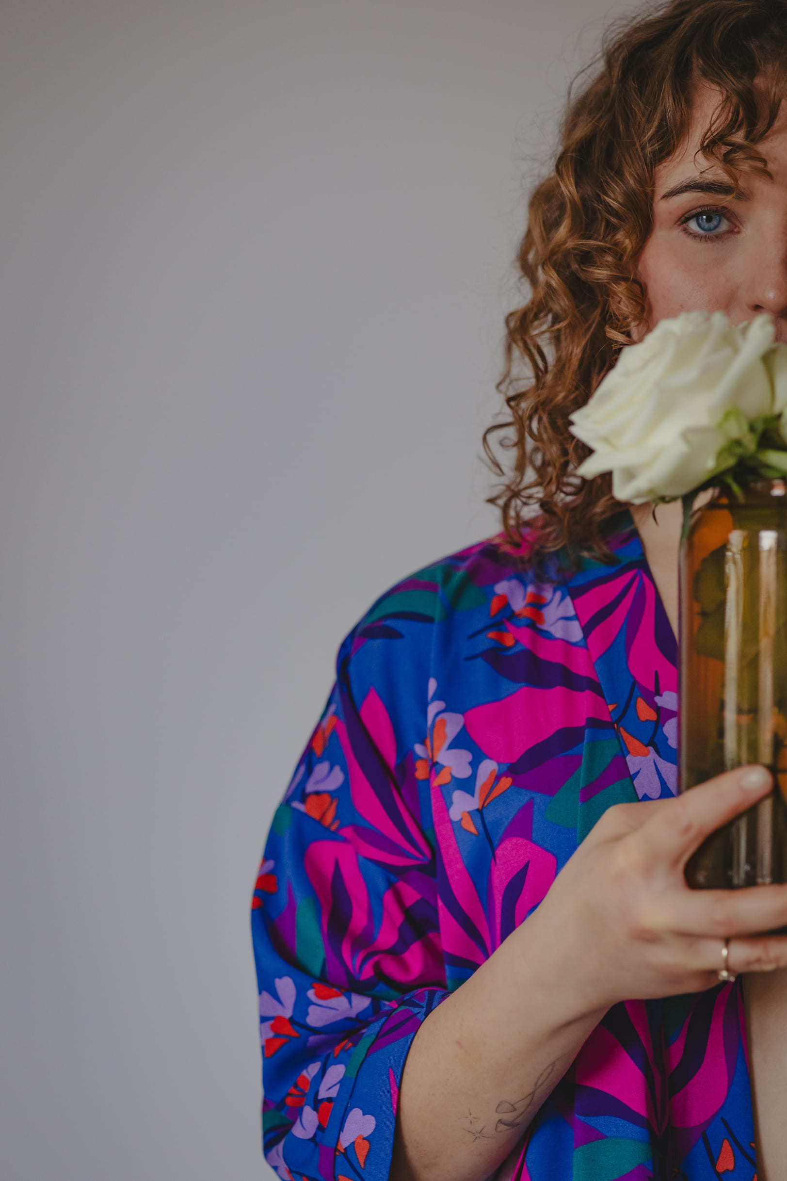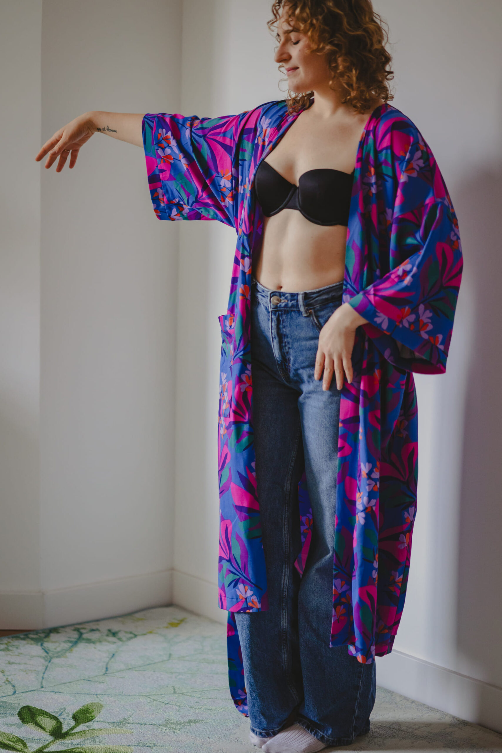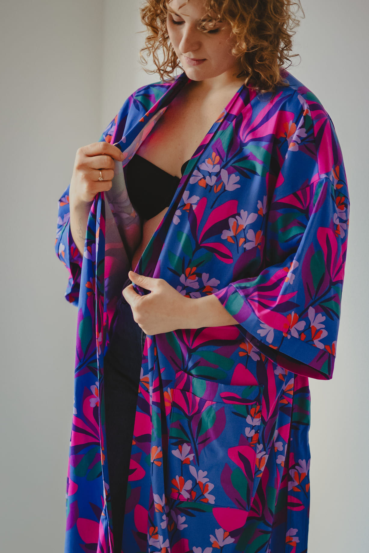 Długi szlafrok o kroju kimonowym, w którym każda mama odnajdzie wygodę i piękno, niezależnie od etapu macierzyństwa. To kobiecy, elegancki komfort, który towarzyszy Ci od pierwszych dni ciąży, przez karmienie, aż po późniejsze chwile domowego odpoczynku. Sprawdzi się nie tylko jako tradycyjny szlafrok, ale też jako narzutka plażowa.