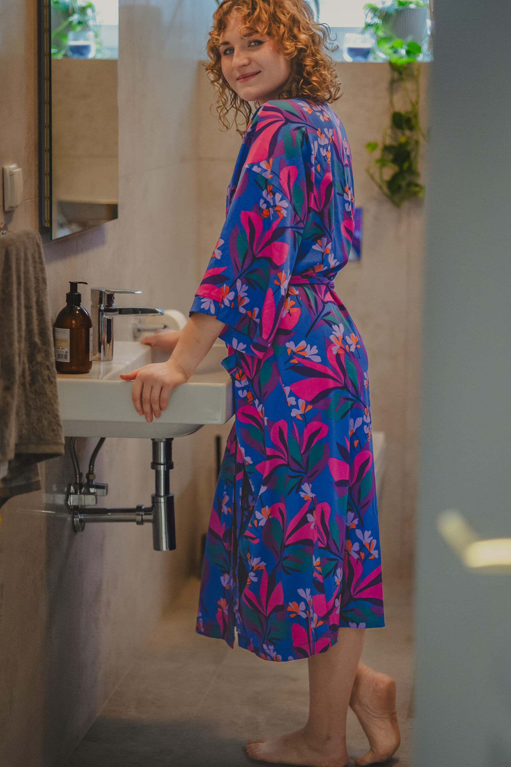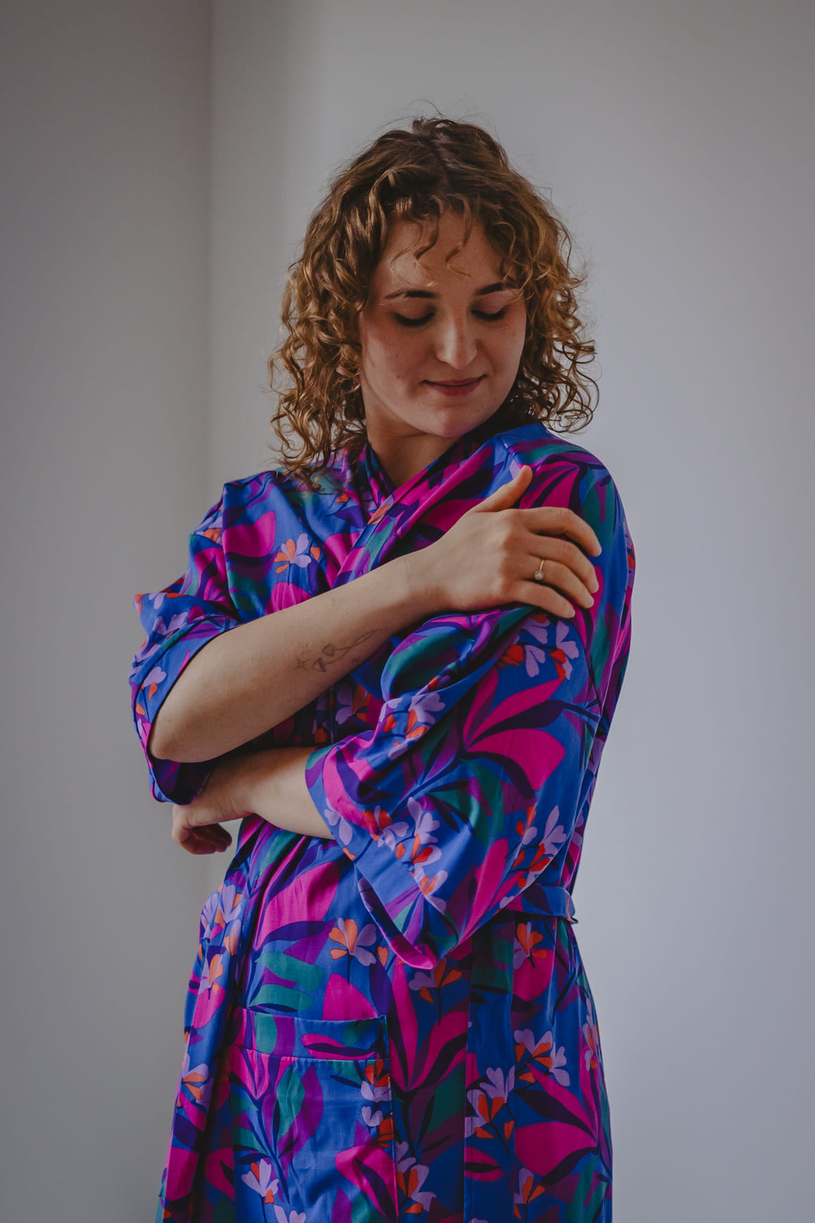 Krój: Długa forma o luźnym, swobodnym kroju z obniżonym szwem na ramieniu i rękawami długości ¾. Dzięki temu szlafrok daje uczucie lekkości i nie krępuje ruchów - idealny, gdy ciało się zmienia, ale Ty wciąż chcesz czuć się sobą.