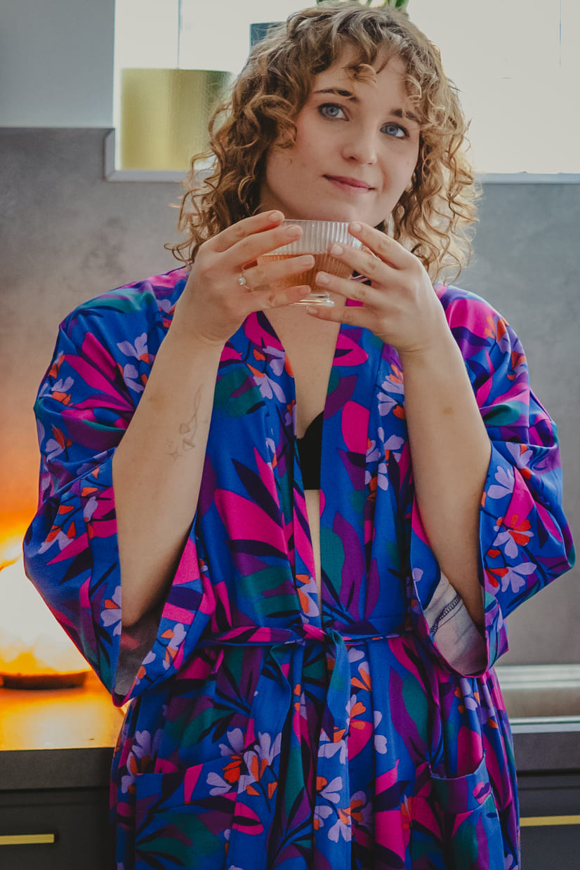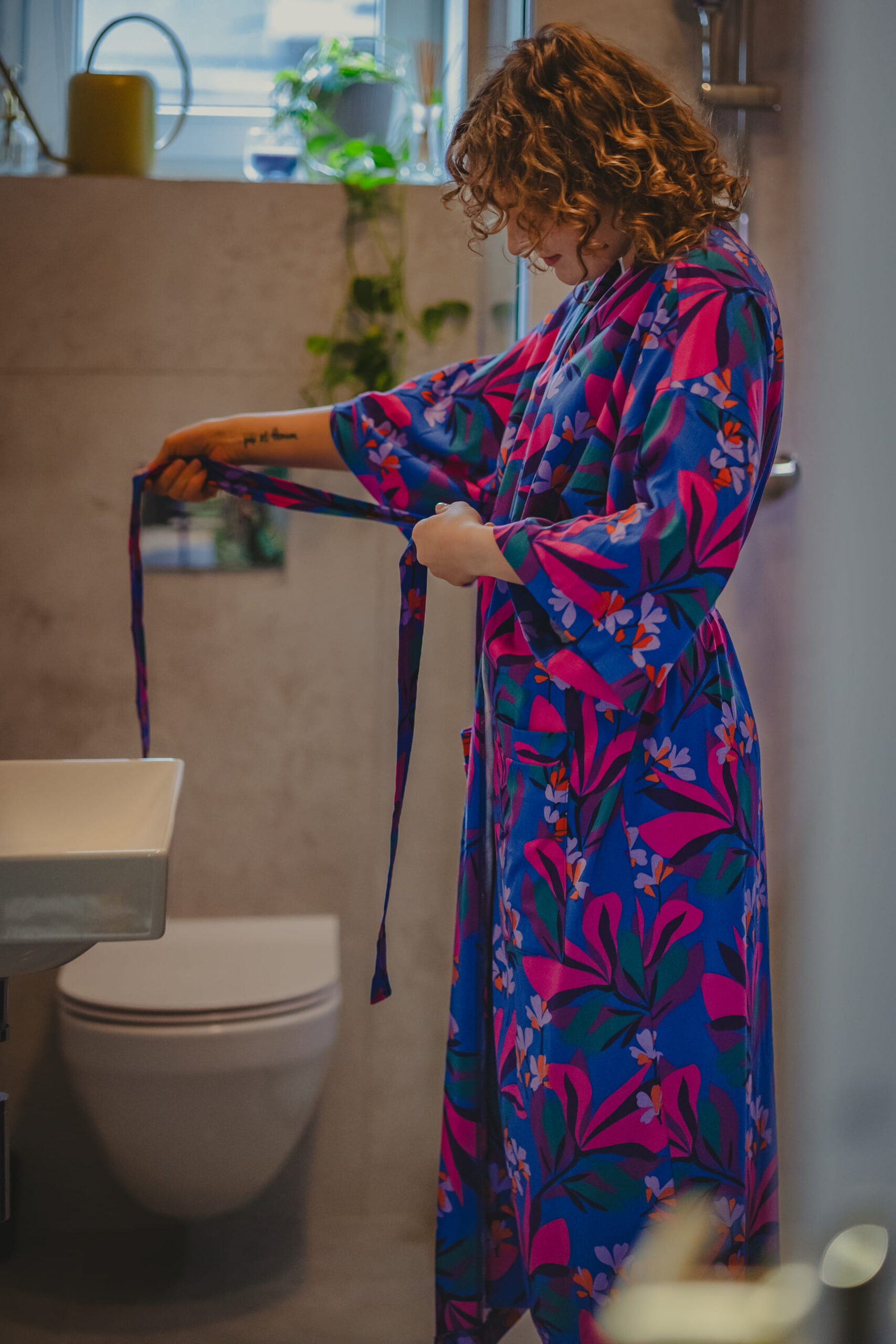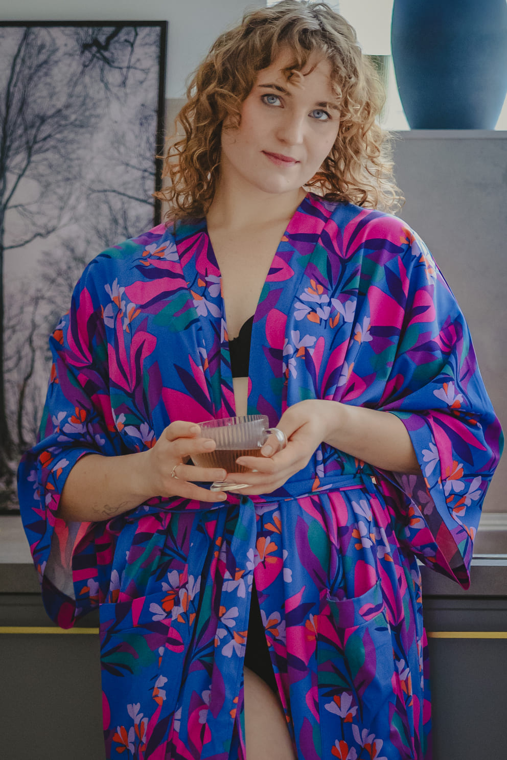 Funkcjonalność: Możesz nosić go luźno, puszczony swobodnie pięknie układa się na sylwetce, ale jeśli chcesz poczuć się bardziej otulona - sznureczki wewnątrz szlafroka pozwalają dyskretnie związać wewnętrzną połę i zapewnić lepsze dopasowanie.