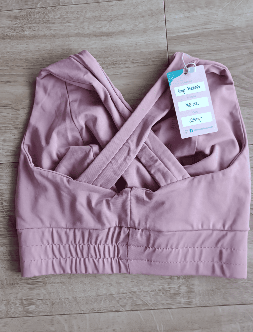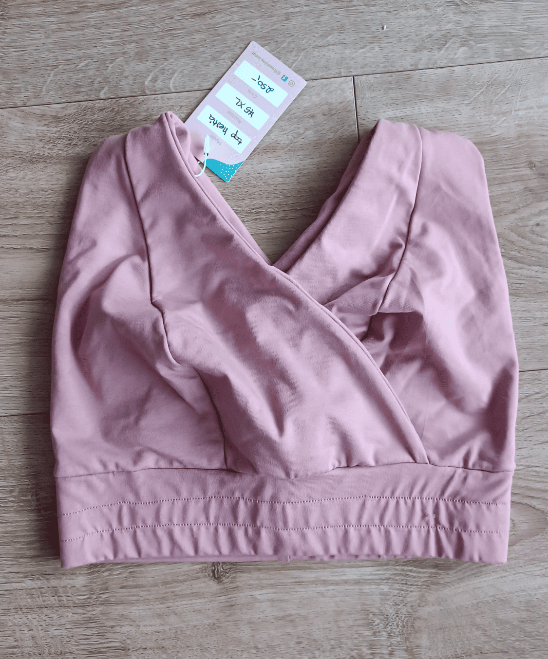Wzmocniony top do karmienia piersią Hestia w kolorze róży herbacianej i rozmiarze 75 XL wkładany przez głowę. Na pasie ślady po poprawionym mocowaniu gumy w pasie z delikatnym przesunięciem szwu. Na pasie malutka dziurka w dzianinie. Top uszyty został szwem o nieco szerszym rozstawie ściegu i mniejszym naprężeniu nici, stąd szwy są nieco bardziej widoczne niż przy standardowym szyciu.